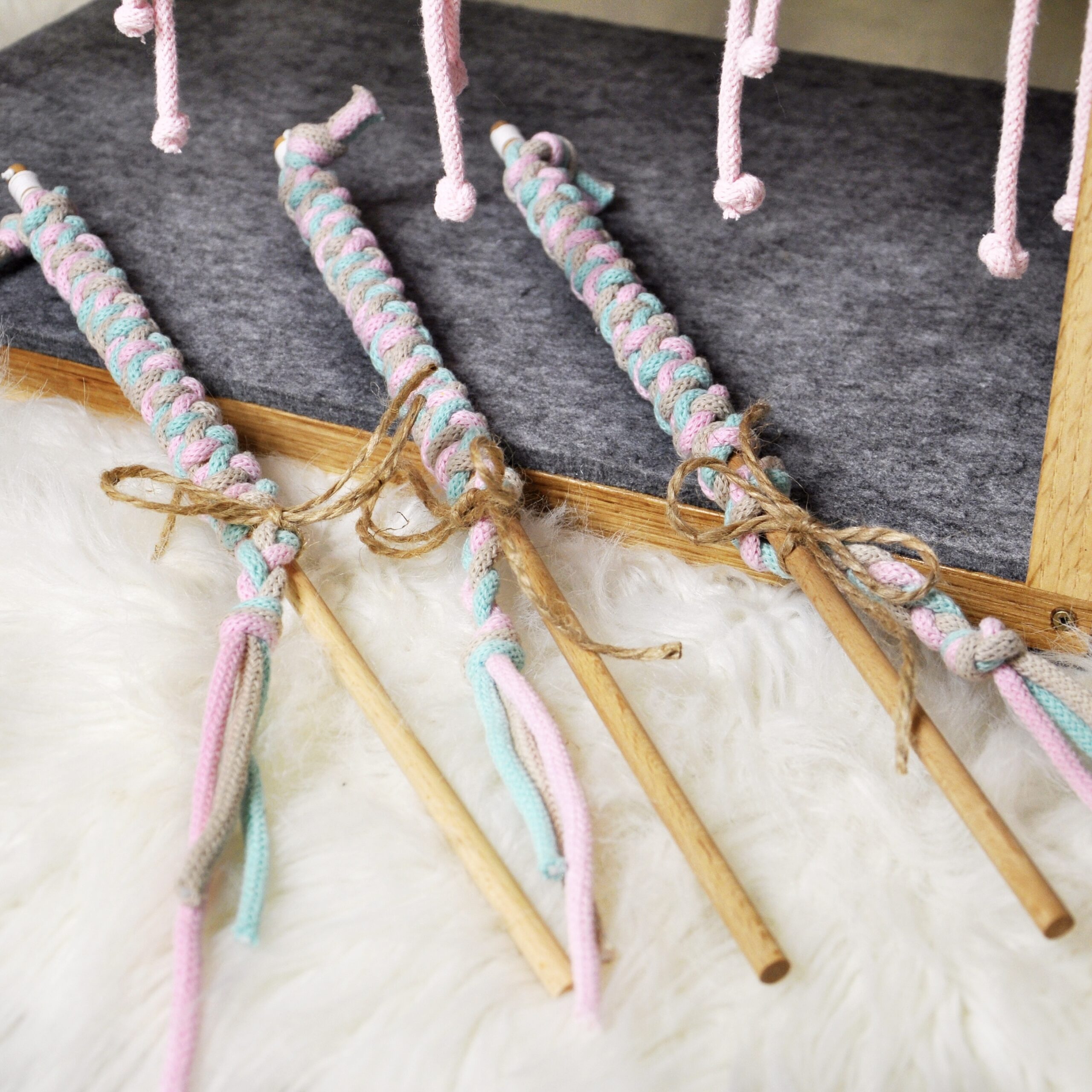 Zabawka dla kota stworzona z bawełnianego 5mm sznurka zaplecionego w warkocz. Warkocz przymocowany jest do ok. 40 cm drewnianego kijka. Wędkę personalizujesz specjalnie dla swojego kotka, wybierz trzy kolory z rozwijanej listy.